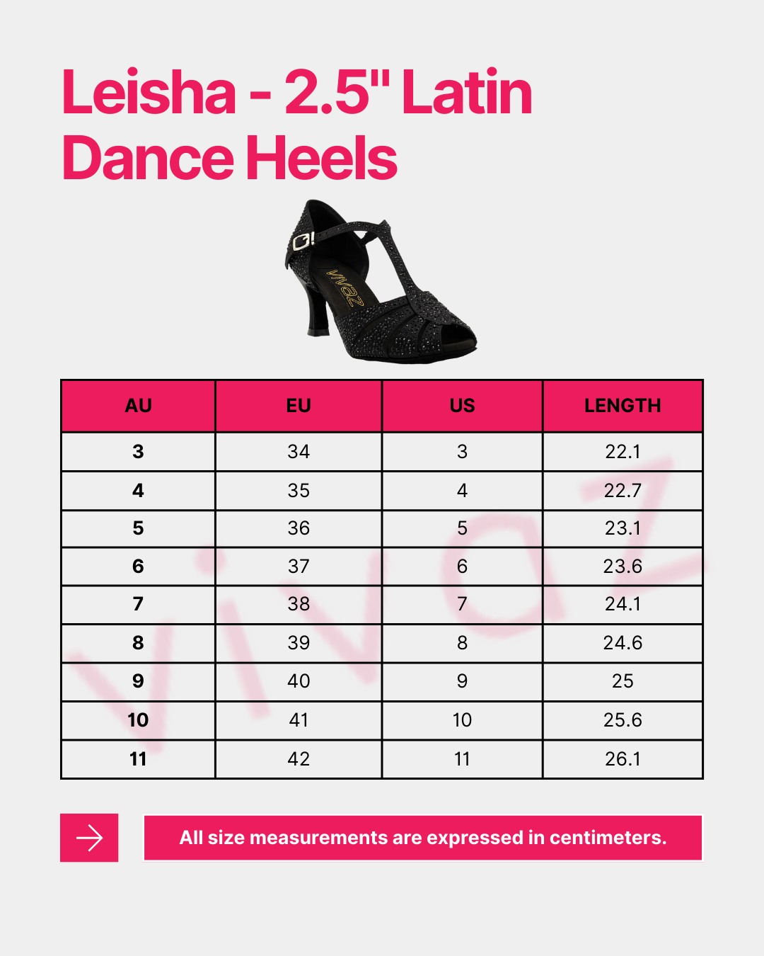 The Leisha is made in EU shoe sizing and is a firm fit. Dance shoes should fit firm and snug. We recommend ordering your usual shoe size in Leisha, or one size up if you have a wide foot.