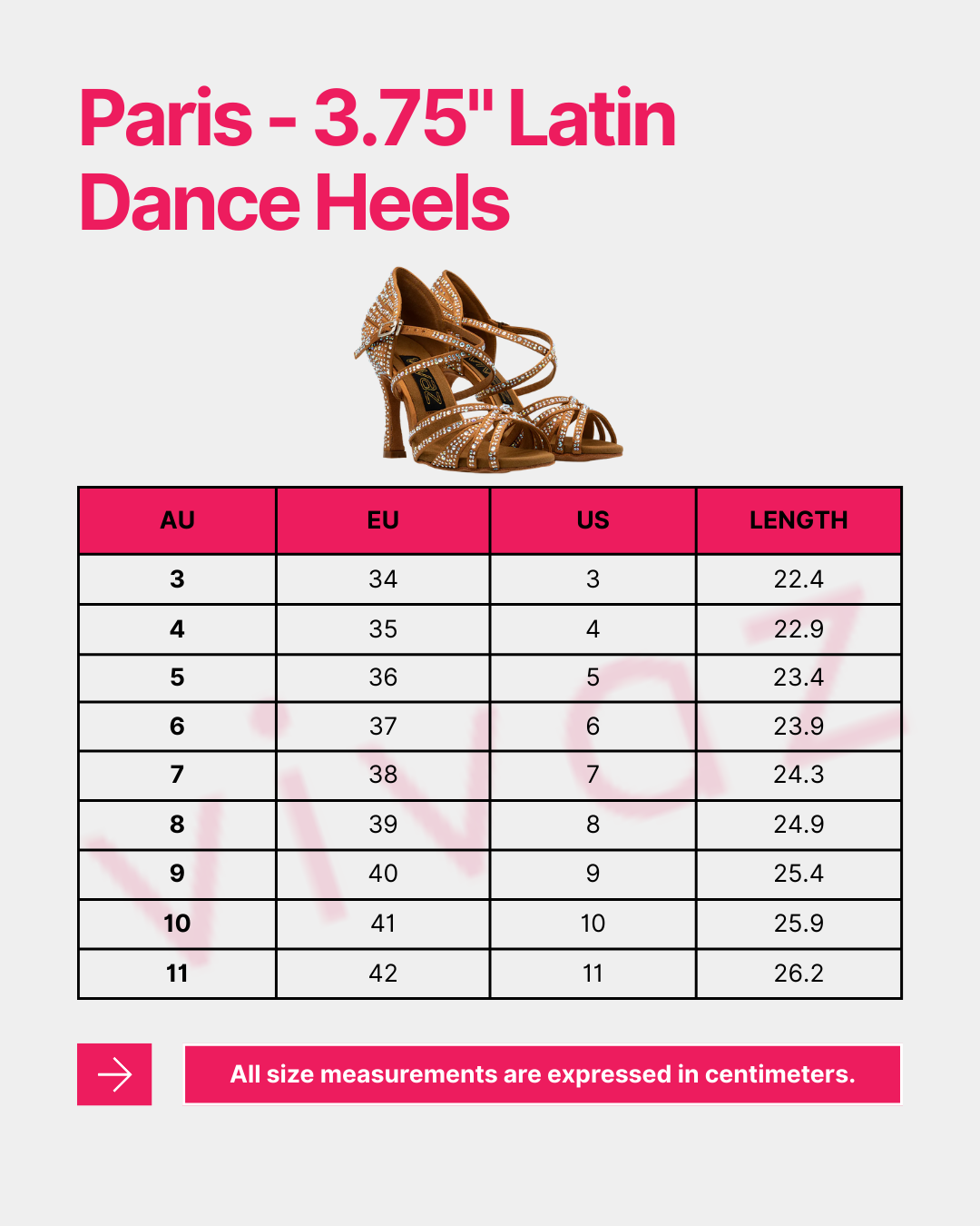 Paris is made in EU sizing and is true to size, designed for a firm, snug fit—just as dance shoes should be. If you prefer a tighter fit, consider ordering your usual size or one size down.