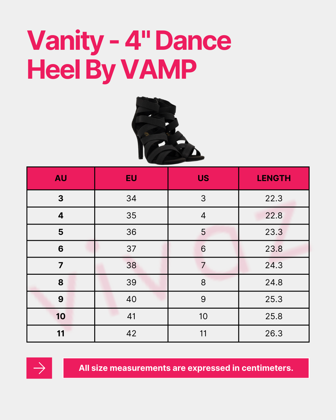 Vanity is made in EU sizing, and for the best support and fit, we recommend sizing down one full size from your regular shoe size—unless you have wide or high-arched feet. Dance shoes are designed to fit firm and snug, allowing them to stretch and mold to your foot over time.