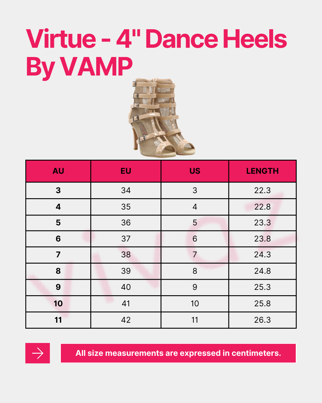 Virtue is engineered for dancers, offering a sleek and stylish look with the perfect balance of support and flexibility. These heels are 100% vegan, made with premium nude patent vegan leather and mesh that is both durable and soft to the touch. Designed with 5 adjustable buckles, Virtue allows for precision fitting to suit narrow or wide feet, making it a great choice for any dancer. The 4-inch stiletto heel is positioned slightly forward for added stability, and the breathable microfibre lining wicks moisture away to keep your feet dry during those long dance sessions.